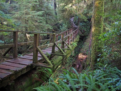 A bridge – built over a massive log – spans a small creek on a trail at Pacific Rim National Park near Tofino, Canada. Tofino, on the west coast of Vancouver Island, is a popular destination for hikers, surfers, and other people seeking to escape the cities and get back to nature. Tofino is about 320km north of the provincial capital, Victoria, and not too far from Vancouver.